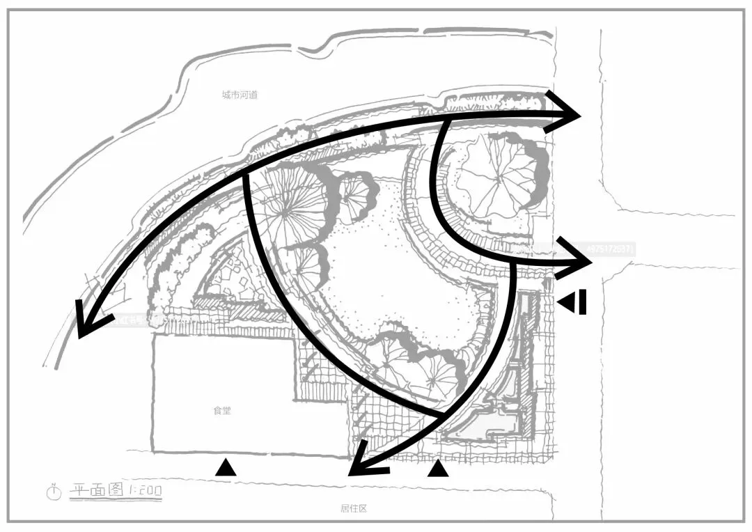 交通流线布局图小场地面积较小,可以不需要详细的一二级分路,但是也要满足场地的通行功能,通过硬质铺装,滨水步道,台阶等丰富通行功能。