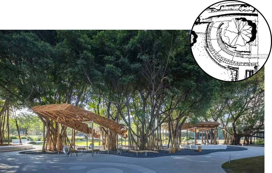 古树承载着社区居民的共同记忆,也是这片土地最生动的景观印记。在古树的荫蔽下,我们构想营造一方开阔的社区广场,为居民日常聊天、广场舞、下棋等休闲活动提供一处自然、亲切的共享场所。这里将成为连接人与人、过去与当下的活力空间。