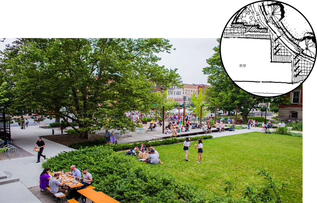餐厅前广场,作为连接内外、融合功能与氛围的过渡空间,在满足餐厅顾客集散需求的同时,亦成为其室内空间的自然延伸。通过合理布置外摆餐位,为居民提供宜人的户外用餐体验,在树影与微风间享受美食与交谈。