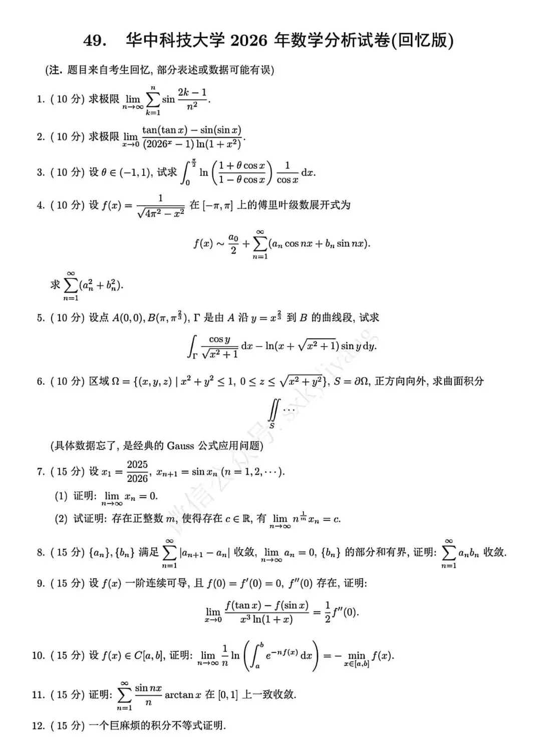 华中科技大学 2026 年的数学分析试题难度与往年持平,涉及知识面广泛,整卷没有偏难怪,大多是经典问题的复现。该试题主要考查了以下知识点: