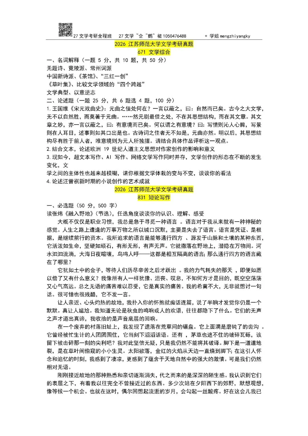真题回放|2026江苏师范文学考研真题