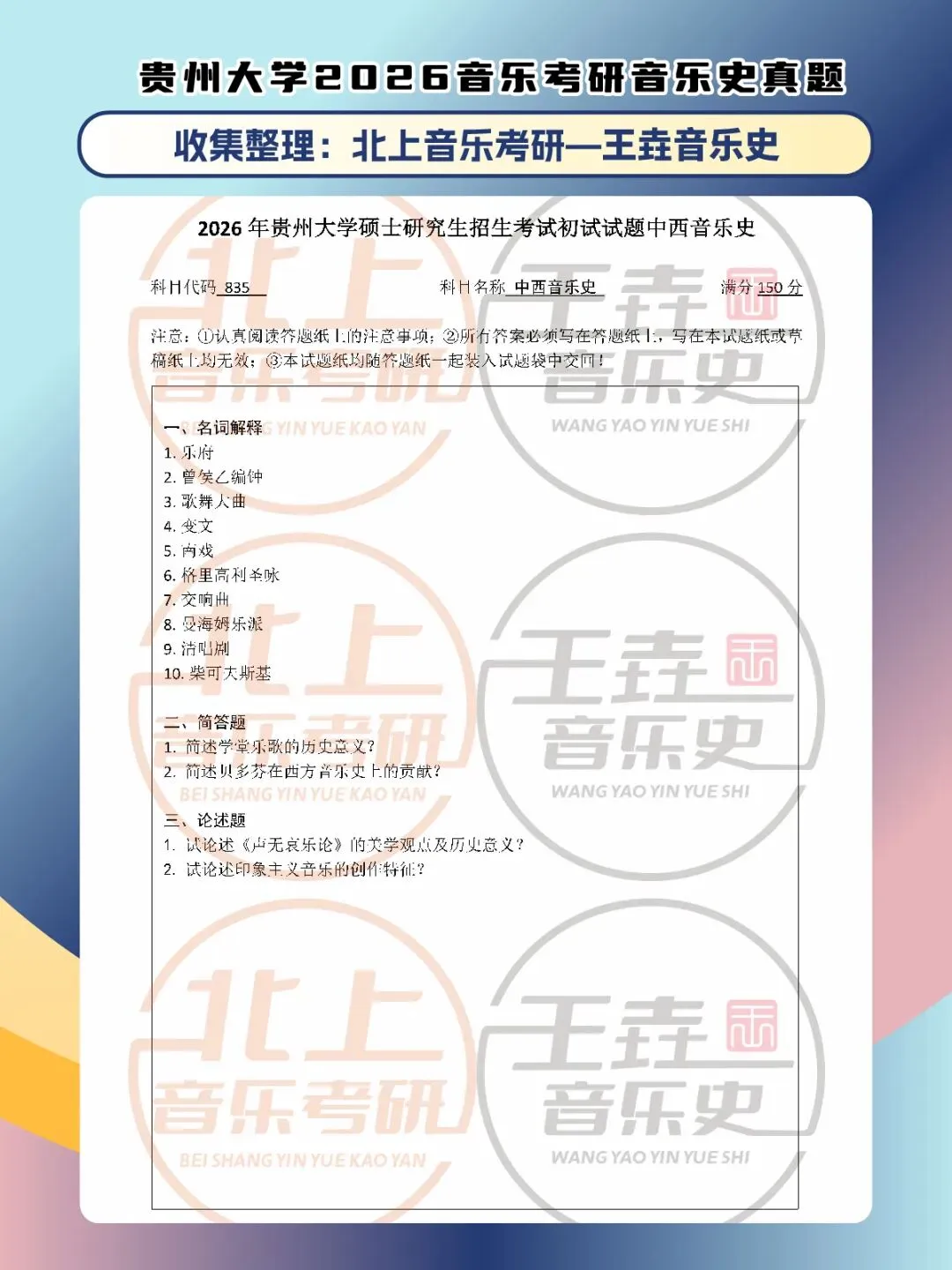 >贵州大学音乐史2026音乐考研音乐史真题|北上音乐考研-王垚音乐史工作室收集整理
