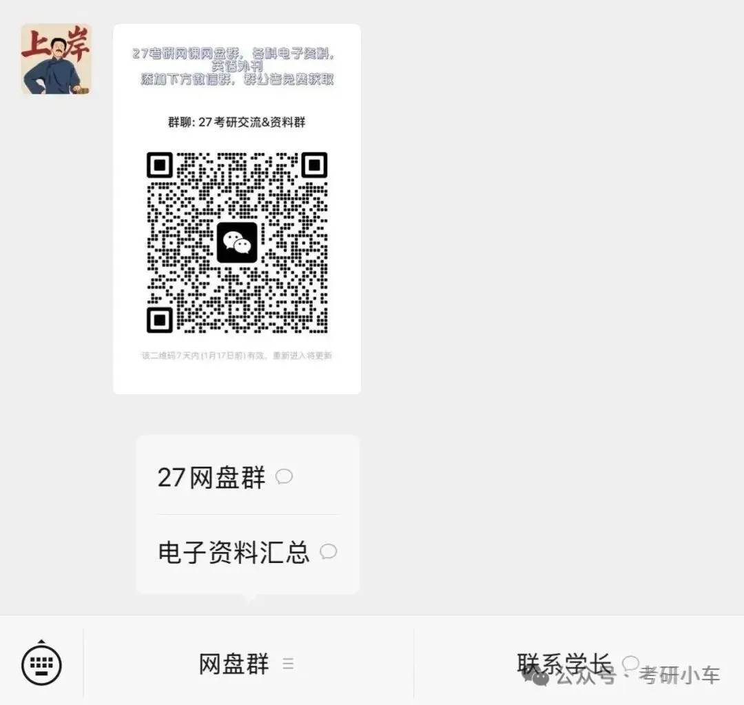 27考研网课群已经开始更新了,有需要的同学可以到27考研交流群的群公告中免费获取哦,群内也可以找搭子以及交流考研问题,以及缺少资料也可在群内@学长为你们无偿寻找。27考研交流群在公众号回复交流