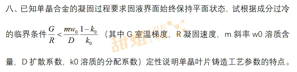 比如第八题要求根据成分过冷临界条件分析单晶叶片工艺参数,需要理论推导与工程实践结合。