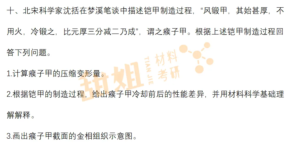 第十题以“北宋瘊子甲制造工艺”为背景,结合冷锻工艺、金相组织、变形量计算等。