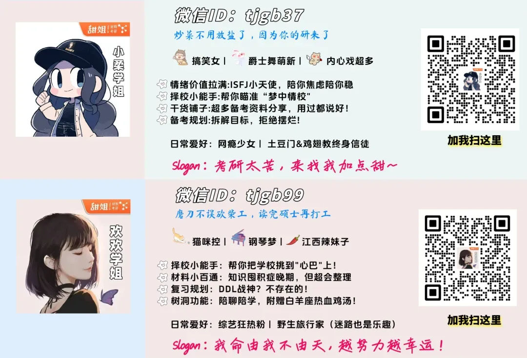 还有关于考研的任何疑问,都可以添加小柔学姐(tjgb37)或欢欢学姐(tjgb99)的微信进行咨询哦!