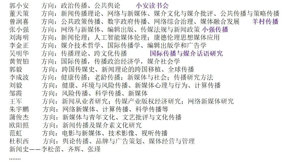 健康传播?国际传播?乡村传播?新闻伦理?公共舆论研究?政治传播研究?网络亚文化?风险传播?新闻史?