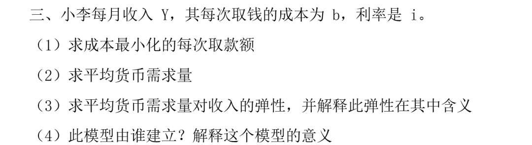 考点:宏观四讲第一讲封闭经济(讲菲利普斯曲线时,孙老师说过先讲失业、再讲通货膨胀,因为菲利普斯曲线横轴是失业率,纵轴是通货膨胀率,讲通货膨胀需要讲4点,定义、分类、原因、成本,该模型为讲预期到的通货膨胀第2个成本-鞋底成本时讲的知识点,也是后凯恩斯的货币需求理论)。高鸿业老师的西方经济学课本上有该模型。并且还考察了微观第一讲第一节课弹性论的知识。
