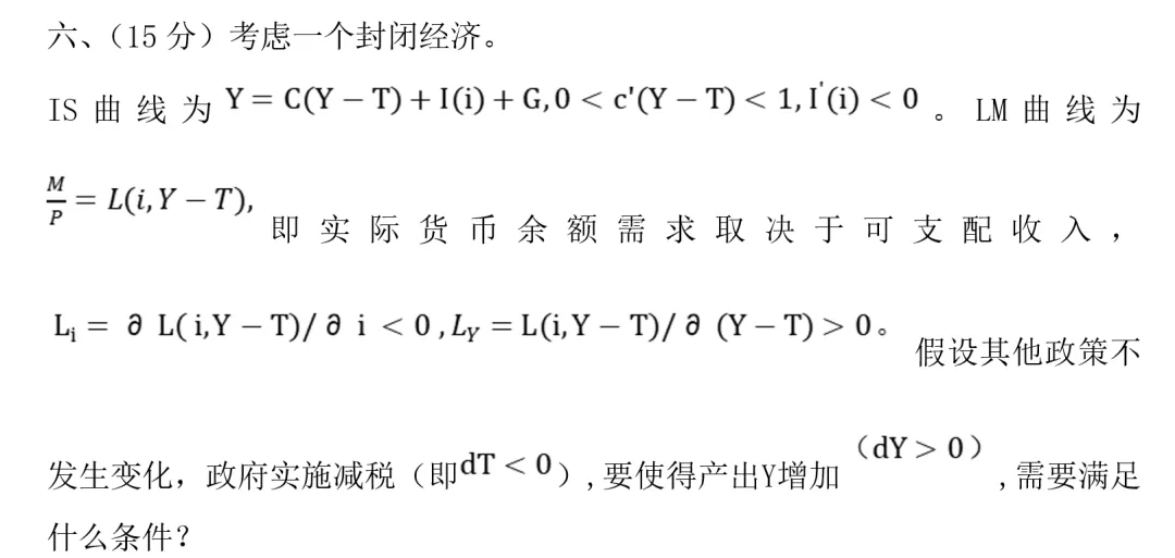 考点:宏观四讲第一讲封闭经济模型。(该类型题是抽象函数表示均衡,然后问其余参数变怎么影响均衡点变的题目,后续年份也很频繁的考这种题型。孙老师在宏观四讲详细的展示了这种题的做法。)