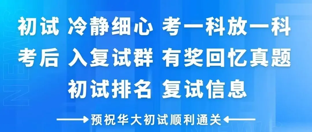 亲爱的考研华大的同学们,2026考研初试即将开始,初试的陪伴划上句号。华研宝全体学长学姐预祝各位学弟学妹初试顺利通关,期待复试再会!