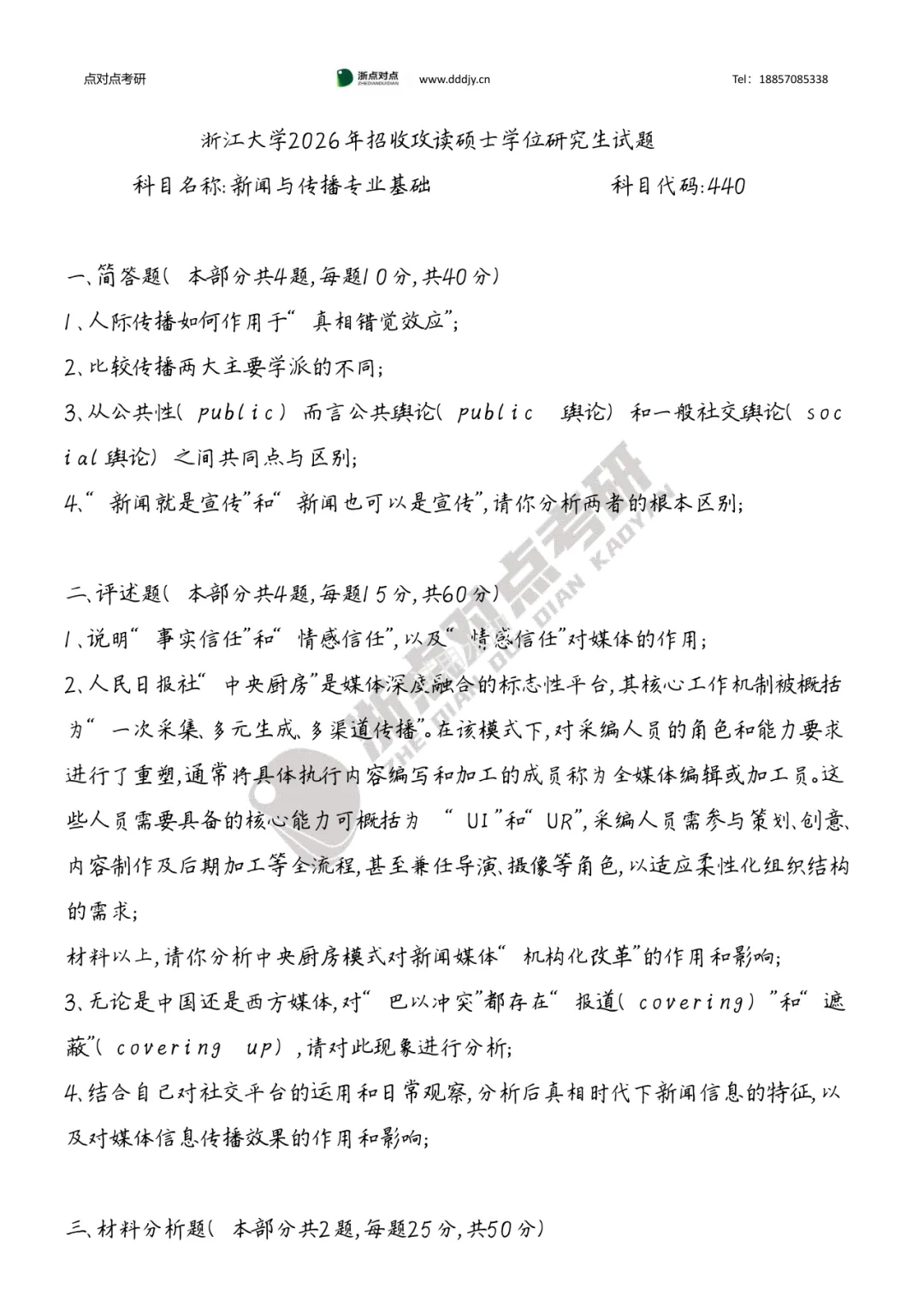 浙江大学2026考研440新闻与传播专业基础真题回忆