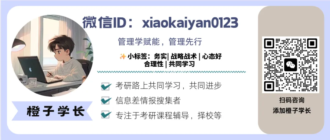 如果宝子们有具体院校的复试调剂疑问,或者需要管科专业课题库、英语面试模板及简历修改,都可以添加橙子学长:xiaokaiyan0123进行咨询!学姐后续也会持续分享更多调剂干货~