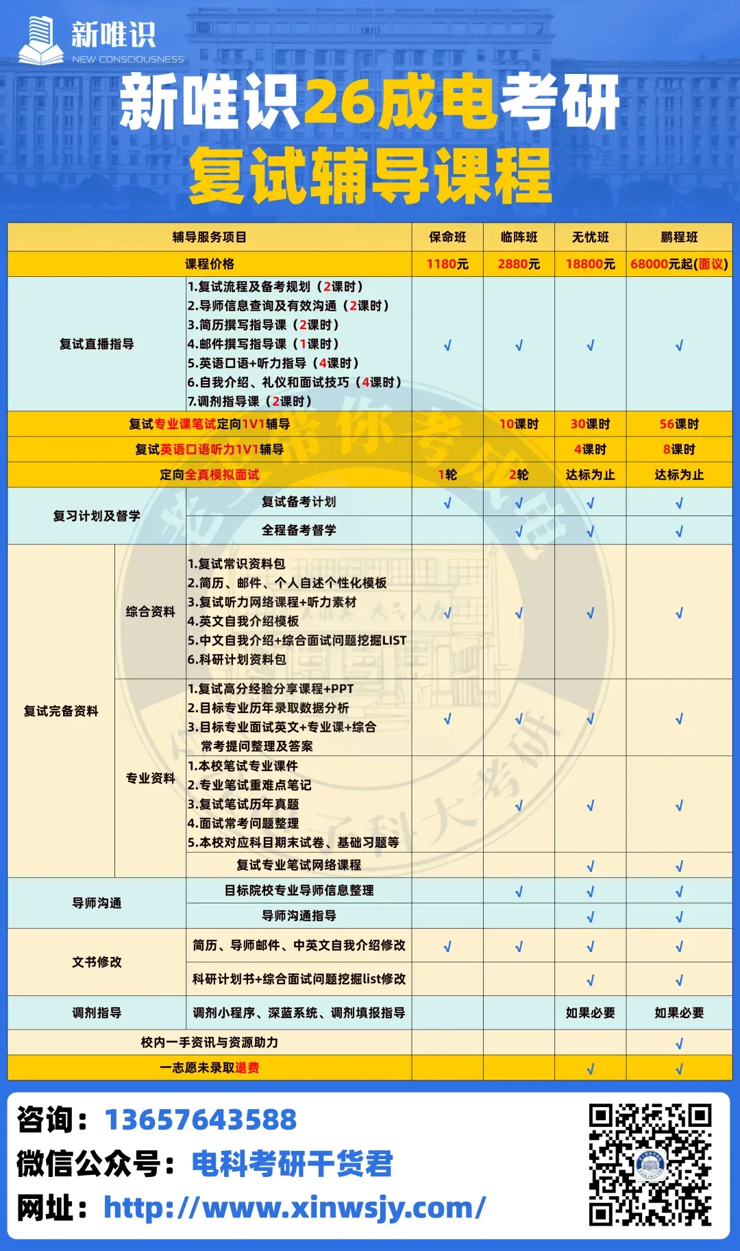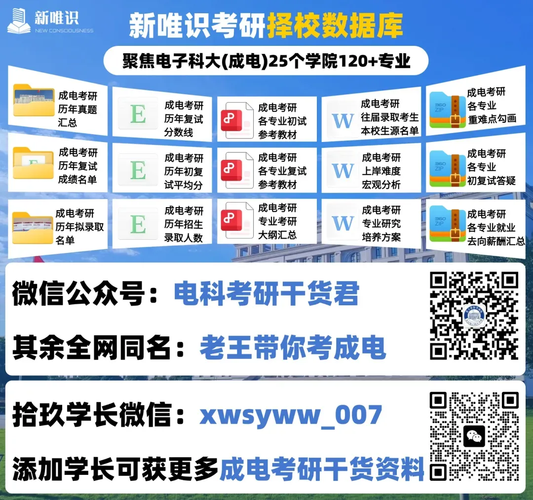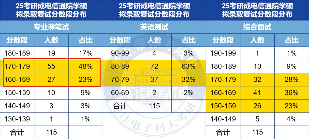 考完初试,别以为到了复试就能松口气——其实复试里专业课才是真正的“分水岭”,搞不好就会“初试高分被刷”,反之也能初试擦线逆袭!对于成电复试,专业课笔试低于120分,直接刷掉,哪怕你初试考了第一名也没用! 这就是“硬门槛”。成电复试专业课笔试分值占比超60%,再加上初复试成绩五五开,专业课直接决定你能不能上岸!复试总分是500分,其中专业课笔试直接占200分,占复试总分40%!再加上综合面试里的专业问答部分,专业课相关分值直接超60%!更关键的是成电初复试成绩各占50%,相当于专业课笔试的每一分,都能直接影响最终录取结果。上面这张表是25考研拟录取考生复试分数段分布。能看出考生复试笔试分数集中在160-179这个区间。也就是说,如果你想稳稳上岸,你的专业课笔试成绩必须冲到这个上游水平。如果你只考了150分,虽然也能录取,但容错率极低,面试稍微发挥失常就可能被刷。成电其他学院专业复试名单及复试平均分分布情况,可以进群查看:成电26考研复试群905829908;成电27考研群1028562027。大家可以看看图中三个案例,能得出结论:不管初试复试占比多少,复试1分都等于初试的好几分!由此可见复试分数的重要性,尤其是对于考成电这种复试占比50%的学校。很多同学初试考完,一看成绩比分数线高不了多少,或者跟前面的人差了几十分,心态就崩了。但你看图里的数据,如果初试差50分,在复试占比50%的情况下,你复试只要多考10分,就能把对方干掉!而在复试中,专业课的占比又尤其重要,是你翻盘的唯一机会。只要复试专业课笔试考得好,初试那点分差根本不算事儿。初试高分的同学,如果专业课答得磕磕巴巴,老师会觉得你只会死记硬背;初试擦线进复试的同学,如果专业课逻辑清晰、见解独到,完全可能逆风翻盘,直接上岸。另外,学校是招你来做研究的,专业课方面表现好,才能证明你有培养潜力。就以26考研为例,预计2月24日出分,成电各学院复试预计从3月25日陆续开始,如果出分后再准备,真正有效的备考时间只有1-2个月,尤其对于基础较弱的同学,时间会非常紧张。所以,如果想要得高分,就要早规划、早准备。 在这一阶段,大家需要梳理教材框架,回顾核心知识点,不用死记硬背,重点是“捡回来”。每天花2-3小时在专业课上,先从最熟悉的章节入手,慢慢找回学习状态。① 查看成电今年的专业目录,明确自己专业的笔试科目,避免复习跑偏;② 过一遍教材,整理出知识框架图,把每个章节的核心知识点标出来,尤其是高频考点;③ 找成电本科课件和期末题,结合这些资料重点看大纲要求内容,不用纠结偏题、难题。主要任务是聚焦高频考点,通过真题掌握出题规律,开始记忆重点内容。① 重点刷成电历年复试真题,这是最关键的!把考点标在教材或框架图上,并锁定分值较高的考点;② 深入复习高频考点,开始背诵记忆,比如名词解释、简答题的核心要点;③ 刷真题时,还要适配成电答题风格,比如简答题分点答,编程题注意书写规范;④ 如果找不到最新真题,就做同专业成电本科期末题,难度和考点都比较接近。在最后这一阶段,需要做模拟考试,查漏补缺,背诵易错点和重点内容。最后一周不用学新内容了,重点是回顾和背诵,保持良好的学习状态就行。① 按照成电笔试时间(一般3小时)进行1-2次模拟考试,用真题或高质量模拟题,严格计时,适应考试节奏;② 考完后对照答案查漏补缺,重点攻克之前标记的易错点;③ 把成电指定教材的重点、课件里的核心内容再背诵一遍,加深记忆。备考时间紧张没关系,跟着上面的规划一步一步来,把指定教材啃透、真题练熟、课件重点抓牢,就没问题。新唯识老王团队专门针对成电各学院考研复试,打造了专属的辅导课程,涵盖划重点、复试真题等全套资料、面试题库和模拟面试指导等,提供全程一站式服务! 如需成电考研复试资料(比如历年真题、简历模板、面试题库等),欢迎加入成电考研复试交流群905829908。
