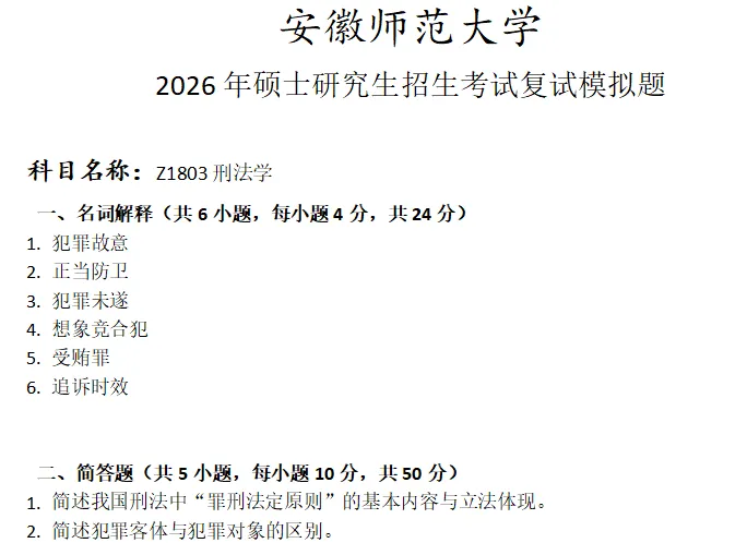 >安徽师范大学Z1803刑法学考研复试真题模拟