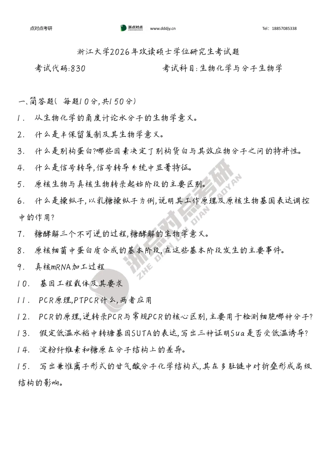 浙江大学2026考研830生物化学与分子生物学真题回忆