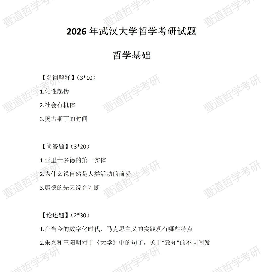 我们先来看看武大26哲学考研真题的全貌: