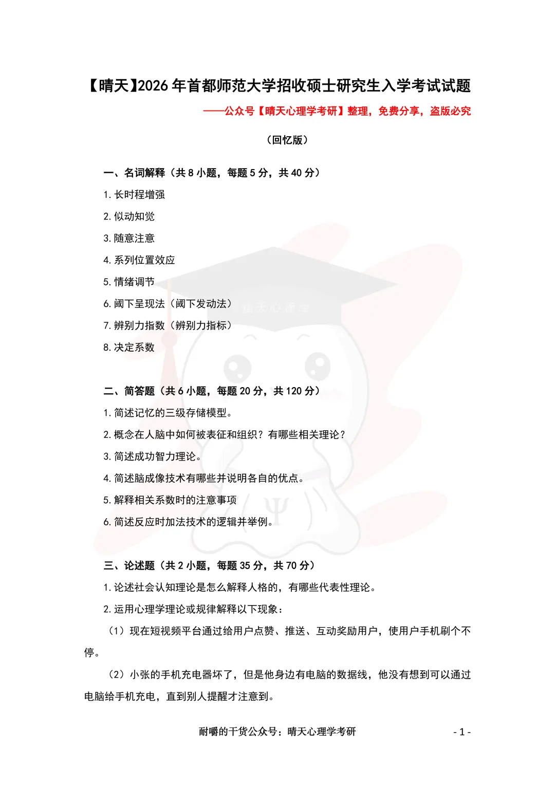 当前位置:首页>考研真题>【心理学考研真题】26年首都师范大学347应用心理真题