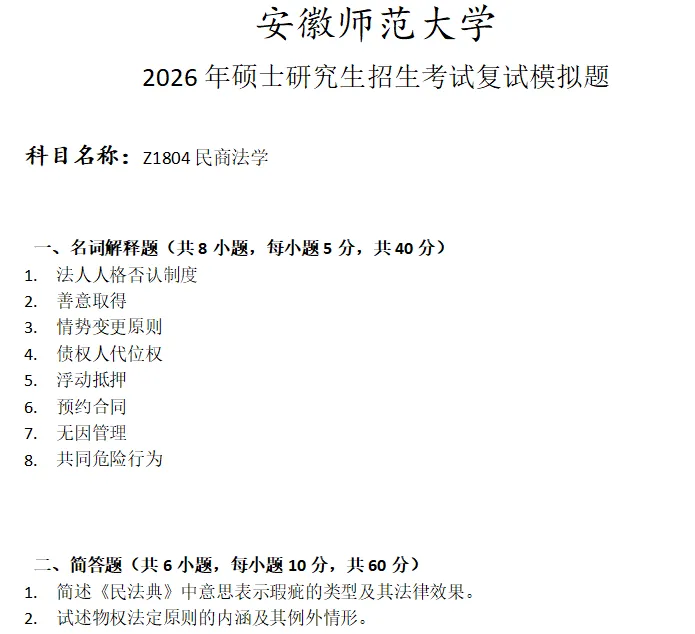 安徽师范大学Z1804民商法学考研复试真题模拟