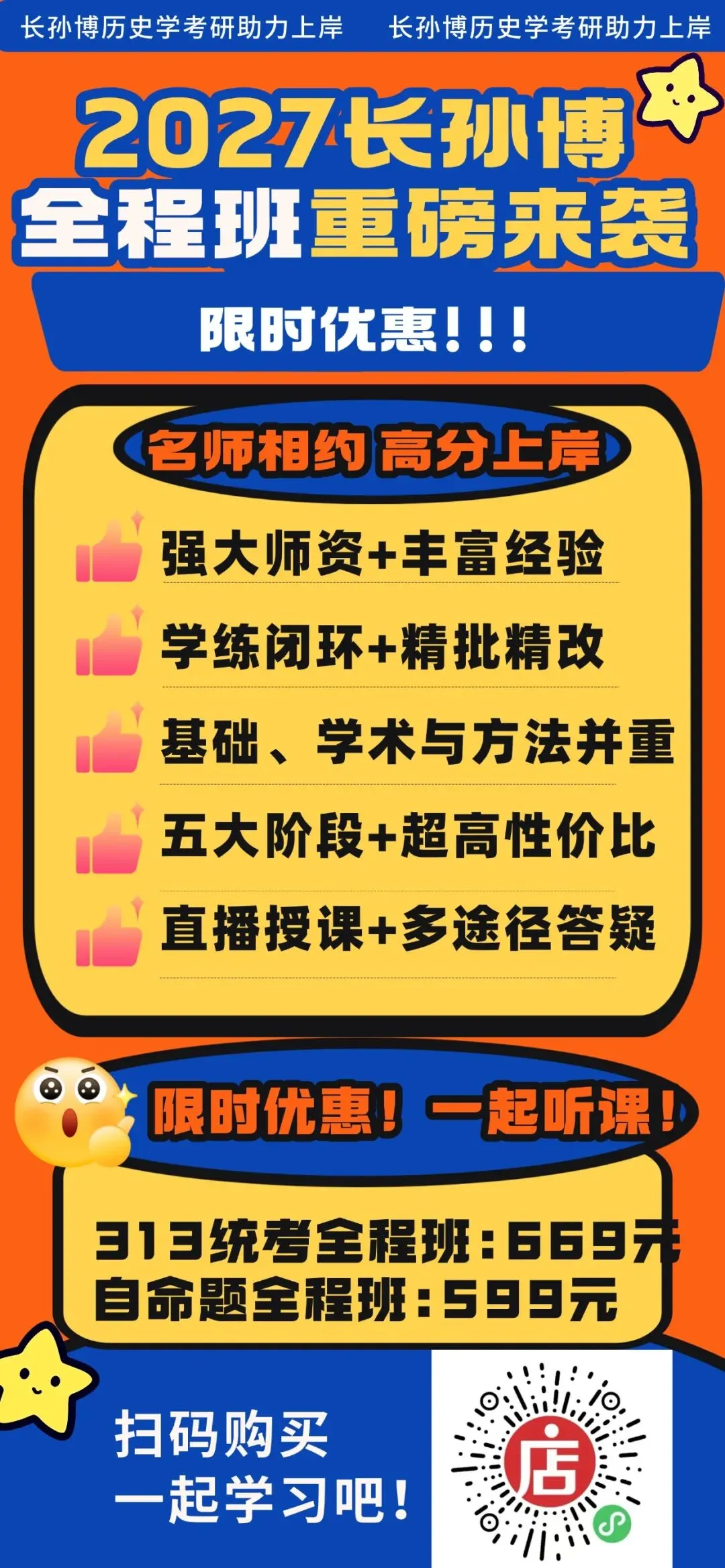 2026考研人正在冲刺,而聪明的2027考研人已经起跑!26考研的这一年,北京大学、南京大学等自命题院校改为313历史学统考,自命题院校所剩无几,统考已成为名副其实的主流命题方式。随着更多院校加入313统考,313统考的题目也更加规范和有章可循。因此,科学备考已成为上岸的核心竞争力!新形势下,如何规划?如何选择?如何上岸?27长孙博全程班申请出战!🤗