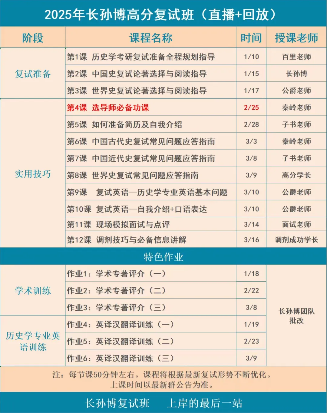目前长孙博全程班第一阶段【导学班】已经开启,经验丰富的长孙博老师团队将会根据120多所院校历年数据,带你深入了解历史学考研的最新信息!包括大家全年复习规划及思路问题、复习方法、教材和教辅的选择和使用、高效阅读教材和搭建框架问题以及大家最关心的择校问题等,确保你在前期准备阶段理清所有困惑,对自己的目标院校、复习任务和方式有清晰的认知!导学阶段也设置各位老师的试听课程,让大家了解各阶段知识学习方法与老师的讲课风格,放心选择长孙博。