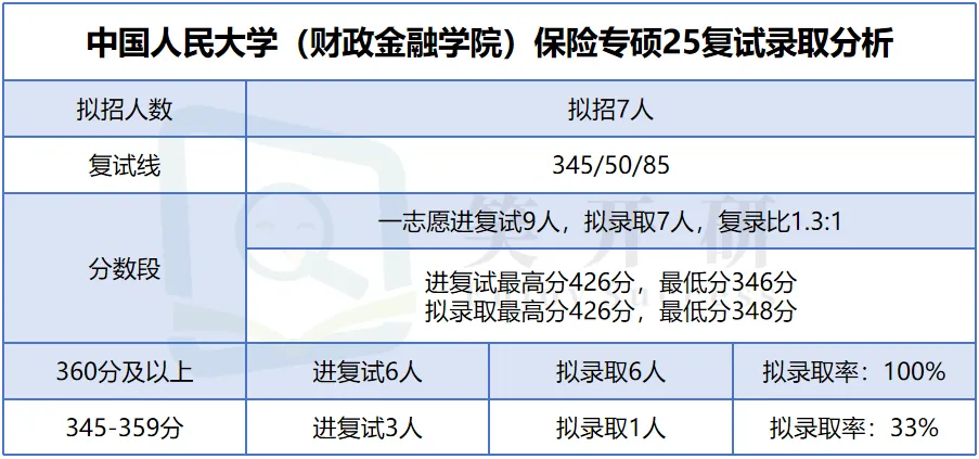 中国人民大学财政金融学院2025年保险专硕共拟招7人,复试线为345分。一志愿9人进入复试,最终录取7人,复录比为1.3:1,竞争总体较为温和。录取考生中,360分以上的6人全部被录取,录取率达100%;而345-359分数段的3人中仅录取1人,录取率为33%。因此,初试高分(360分以上)是录取的稳固保障。