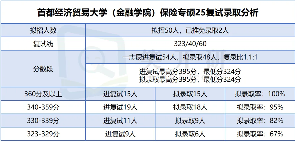 首都经济贸易大学金融学院2025年保险专硕计划招生50人(含推免2人),复试线为323分。一志愿共54人进入复试,最终录取48人,复录比仅为1.1:1,竞争不大。从数段来看:360分以上15人全部录取,录取率100%;340-359分录取率95%;330-339分录取率82%;323-329分录取率也达到67%。该校录取稳定性高,即使低分段考生仍有较大录取机会。