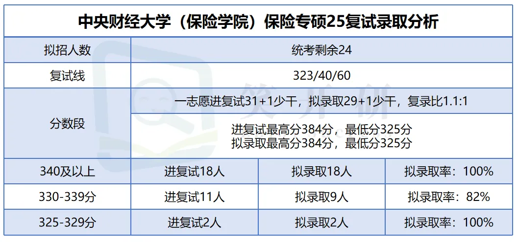 中央财经大学保险学院2025年保险专硕原计划统考招生24人,复试线为323分。一志愿共31人(不含1名少干计划)进入复试,最终录取29人(不含1名少干计划),复录比约为1.1:1,竞争温和。从录取分数段看:340分及以上18人全部录取,录取率100%;330-339分录取率82%;而325-329分虽然仅2人进入复试,但均被录取。整体来看,该校复试淘汰率较低,初试成绩较高者录取十分稳定,且中低分段(325分以上)考生亦有较高的录取机会。