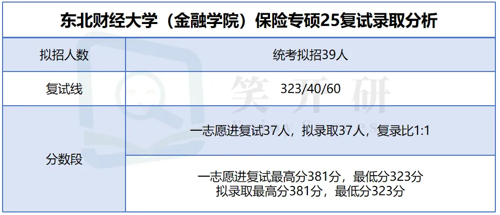 东北财经大学金融学院2025年保险专硕计划统考招生39人,复试线为323分。一志愿共有37人进入复试,最终全部被录取,复录比为1:1,实现等额录取。录取考生中最高分381分,最低分323分,所有过线考生均被录取,竞争压力极小,复试环节基本不构成淘汰,只要初试过线即具备极高的录取确定性。