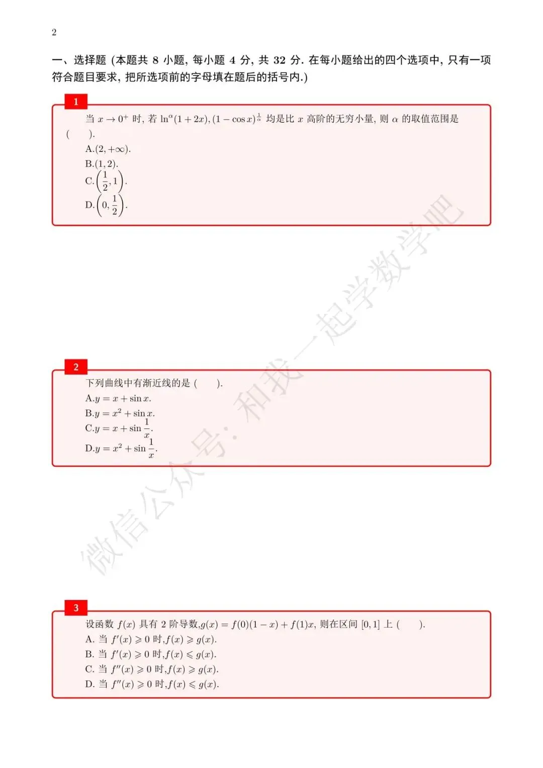 为了方便各位小伙伴们刷题,我重新排版了14年数二的真题,在每道题下面都增加了空白,方便大家写答案,记录相关知识点。