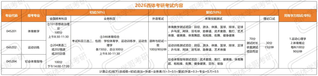 复试占比50%,含体育技能(70分)+ 外语笔试(30分)。专科/同等学力考生须加试两门,务必提前准备。