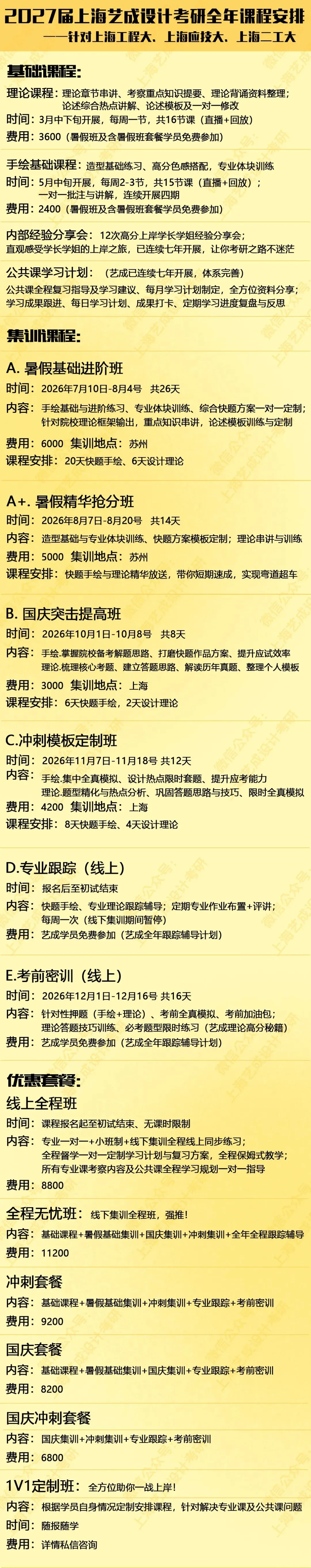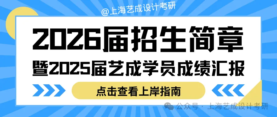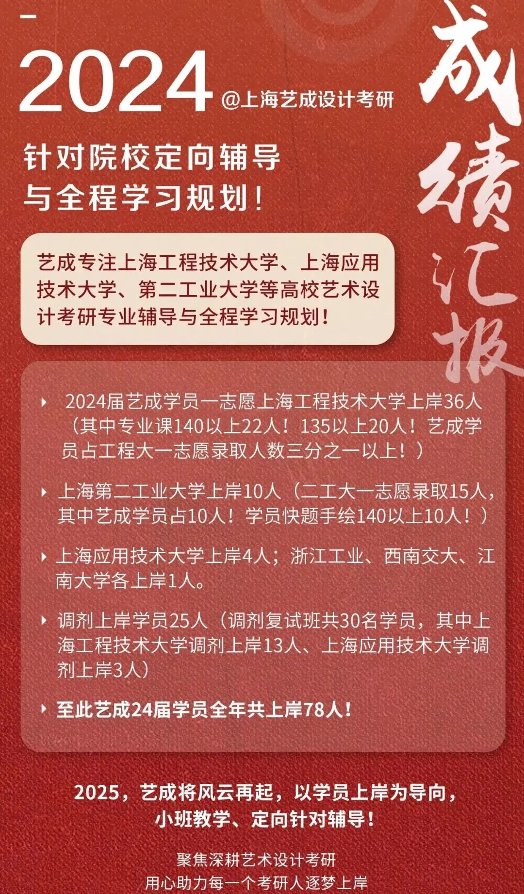 今年已经是艺成考研之旅的第八年,自成立开始,艺成一直坚持针对式辅导、小班式教学,经过对课程体系的悉心打磨,对上海第二工业大学的考试内容、风格偏好的精心推敲,艺成推出针对上海第二工业大学的27届设计考研课程,秉持着对学员绝对的负责之心,艺成“十年磨一剑”,今年,我们一起肩并肩!今年,我们一起稳稳上岸!