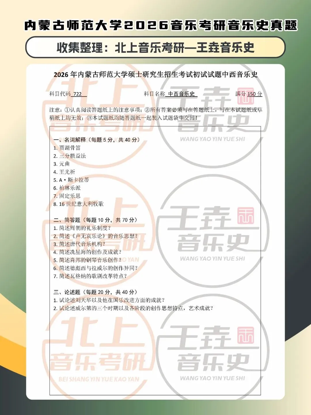 >内蒙古师范大学2026音乐考研音乐史真题|北上音乐考研-王垚音乐史工作室收集整理