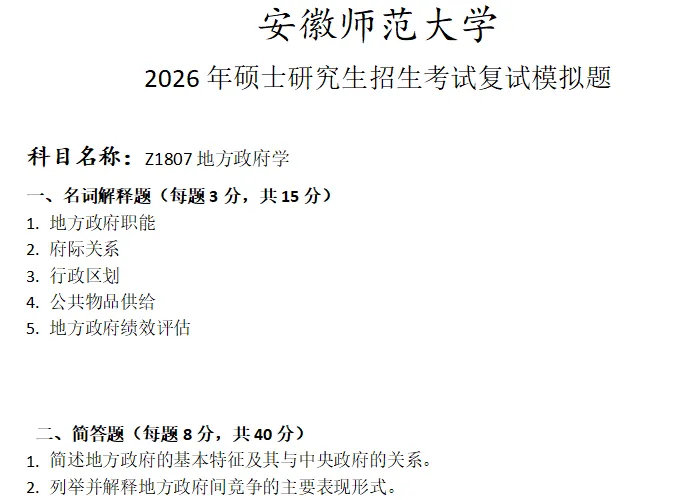 >安徽师范大学Z1807地方政府学考研复试真题模拟