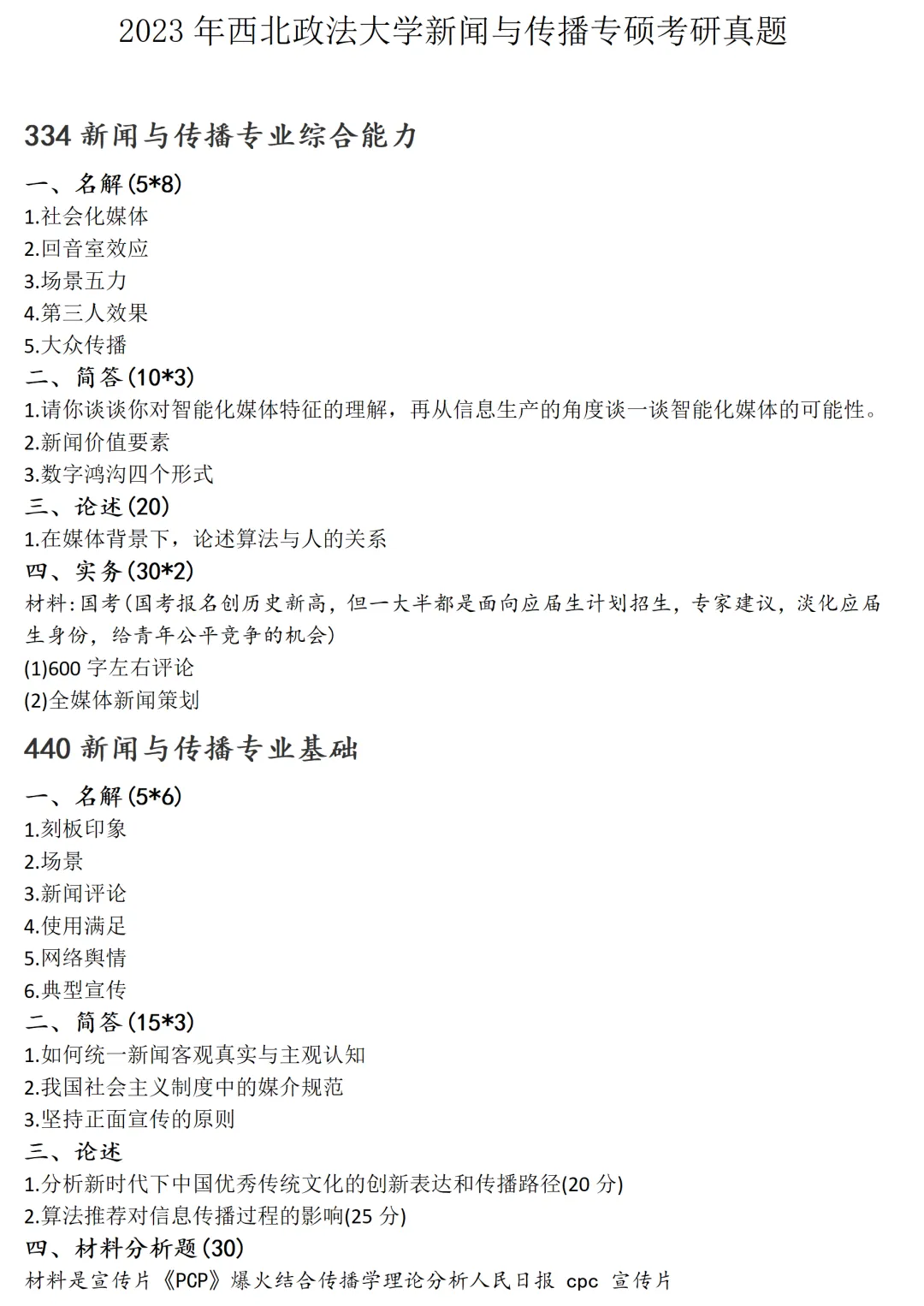 >西北政法大学新闻与传播考研真题2023
