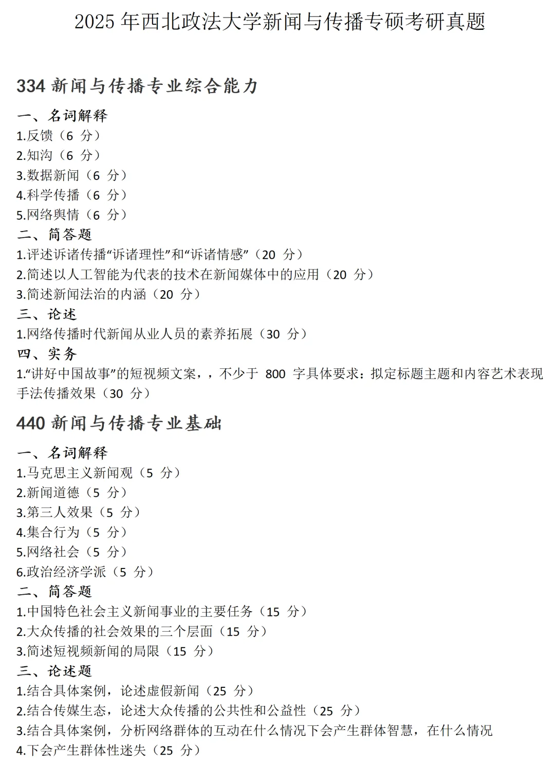 西北政法大学新闻与传播考研真题2018-2025历年