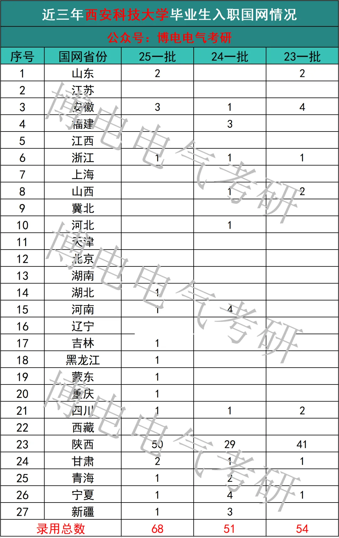 近三年西安科技大学毕业生入职电网情况如下:25届一批共计68人入职国网,24届共计51人,23届共计54人!