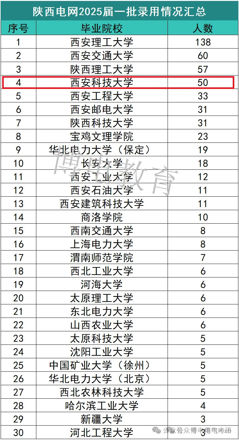 陕西电网2025届一批录用情况汇总如下:其中西安理工大学、西安交通大学和陕西理工大学的录取人数排名前三!而西安理工大学录取人数最多!共计录取138人!西安交通大学录取60人,陕西理工大学录取57人!另外,西安科技大学录取50人,排名第四。
