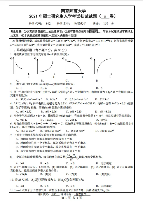 21年物理化学考研真题