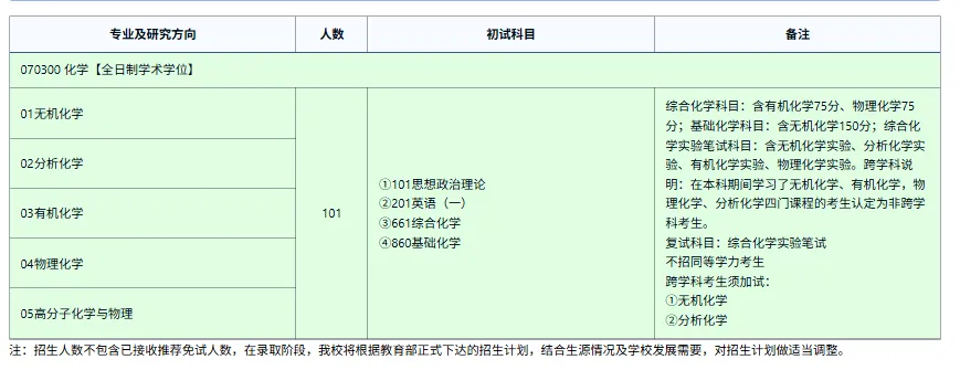 综合化学科目:含有机化学75分、物理化学75分;基础化学科目:含无机化学150分;综合化学实验笔试科目:含无机化学实验、分析化学实验、有机化学实验、物理化学实验。跨学科说明:在本科期间学习了无机化学、有机化学,物理化学、分析化学四门课程的考生认定为非跨学科考生。复试科目:综合化学实验笔试不招同等学力考生跨学科考生须加试:①无机化学②分析化学