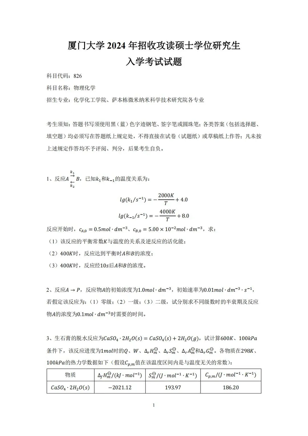 24年物理化学考研真题