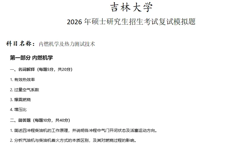 吉林大学内燃机学及热力测试技术考研复试真题模拟含答案