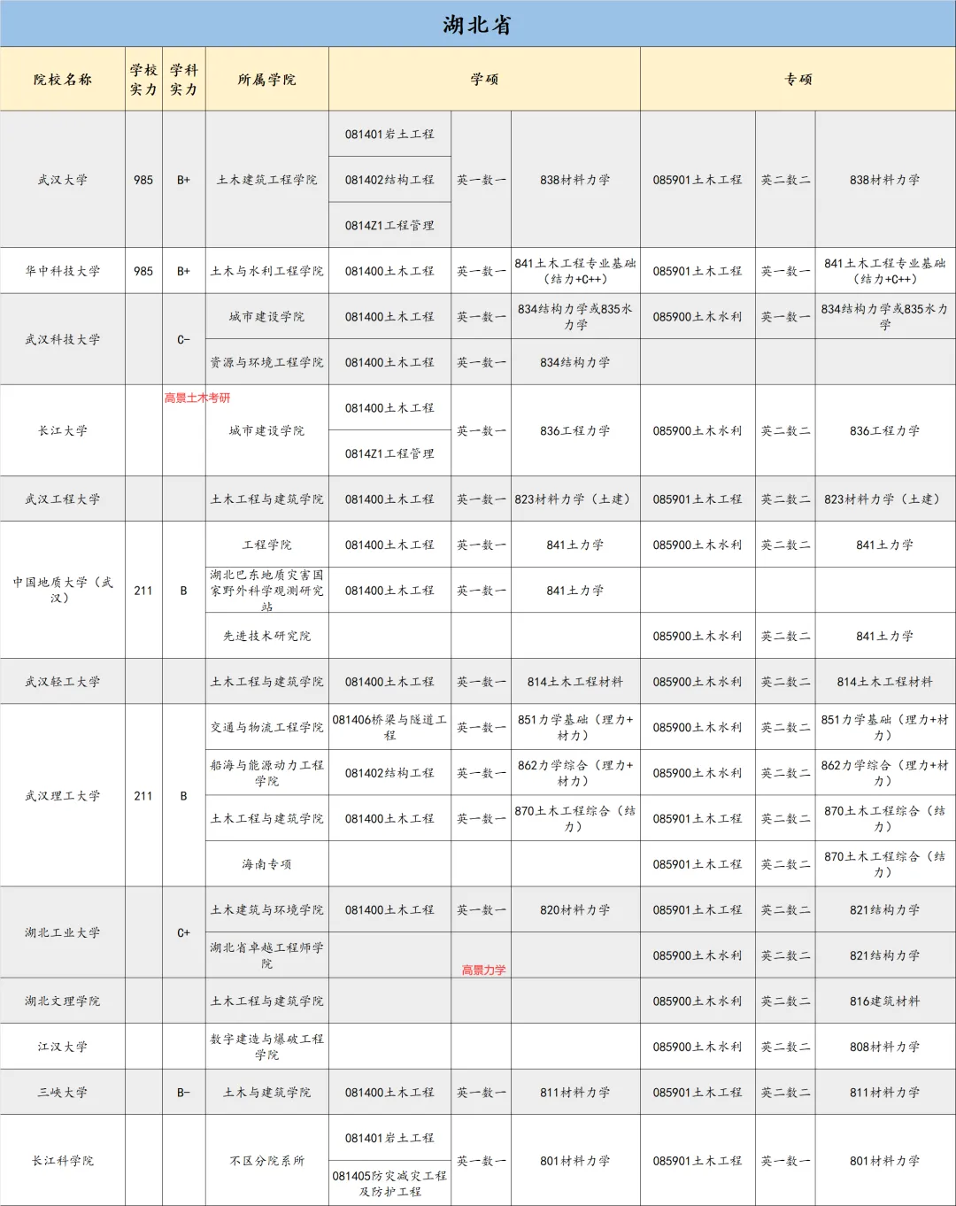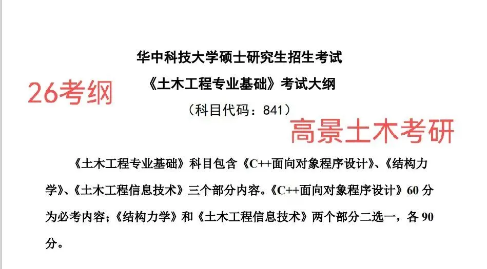 本次分享的是位于湖北武汉的985高校——华中科技大学历年录取土木相关研究生的情况!!!华科是985。在第四轮学科评估中,华科为B+,了解更多详情,扫码加华科考研群~华中科技大学招收土木类硕士,具体考试科目如下表: