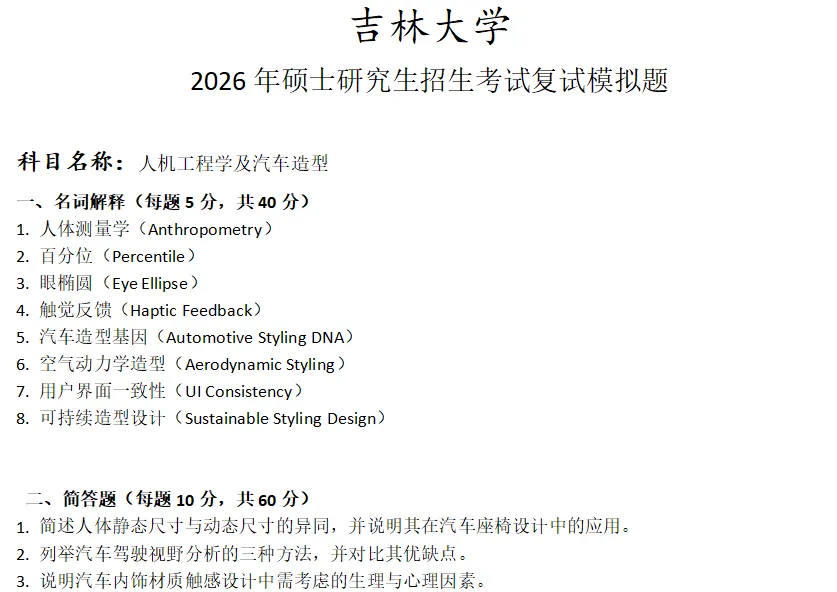 吉林大学人机工程学及汽车造型考研复试真题模拟含答案