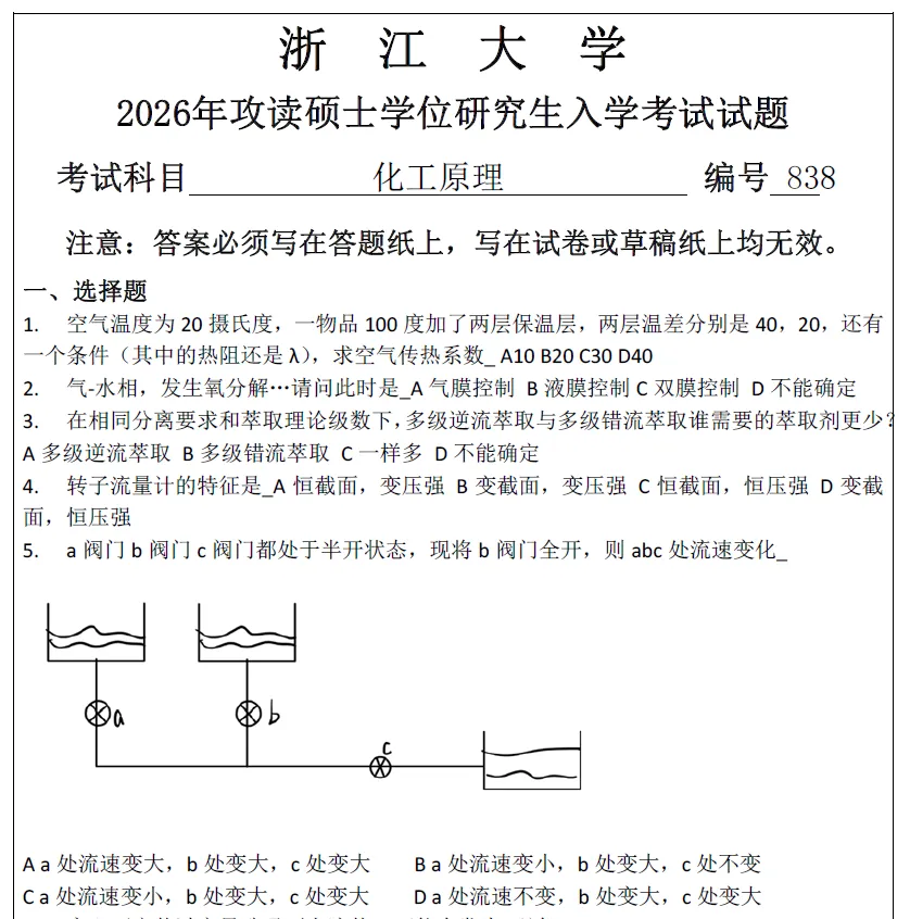 1、2026浙大化工原理(838)考研模拟预测押题试题一