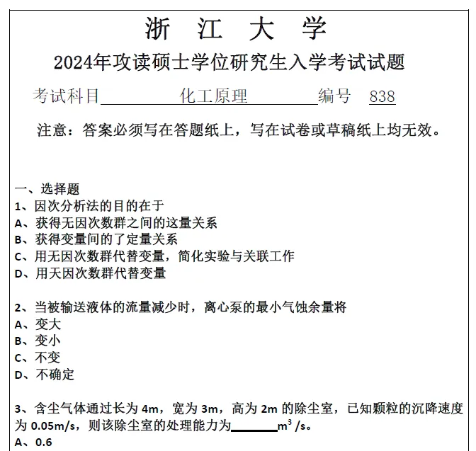 1、2024浙大化工原理(838)考研模拟预测押题试题一