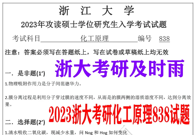 2023浙大化工原理(838)考研模拟预测押题试题二答案解析