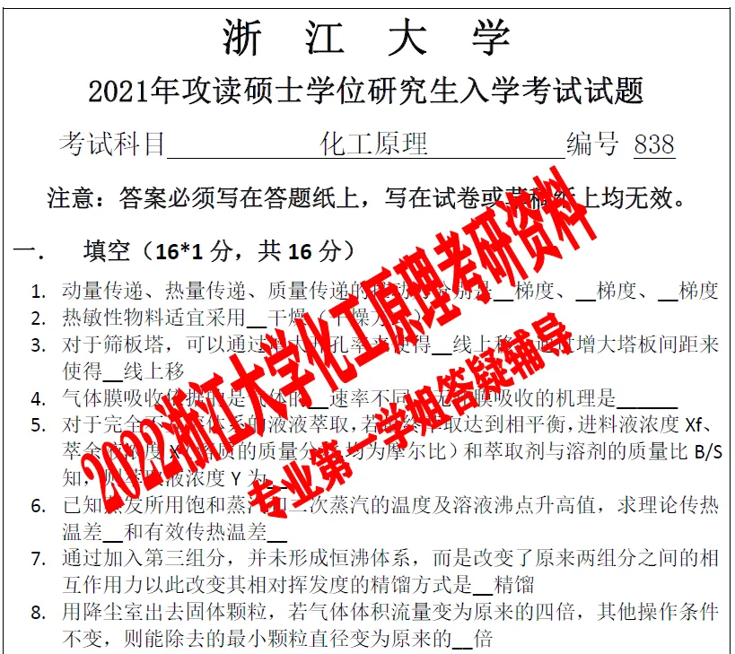 2022浙大化工原理(838)考研模拟预测押题试题一答案解析