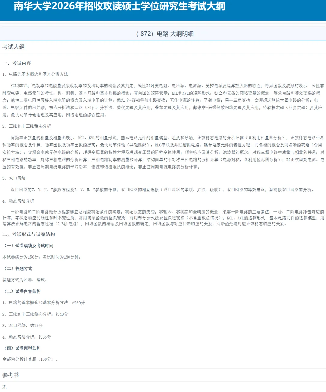 26届湖南省电气考研院校初、复试科目整理如下:其中,南华大学初试专业课考察872电路,复试中的专业课笔试为微机原理与应用、电路原理、电子技术(含模拟电子技术和数字电子技术),三选一。