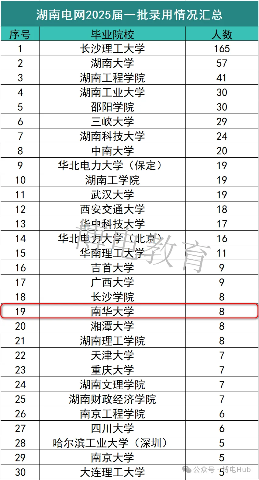 湖南电网2025届一批录用情况汇总如下:其中长沙理工大学、湖南大学和湖南工程学院的录取人数排名前三!南华大学录用8人!