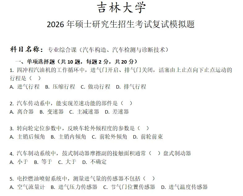 吉林大学专业综合课(汽车构造、汽车检测与诊断技术)考研复试真题模拟含答案